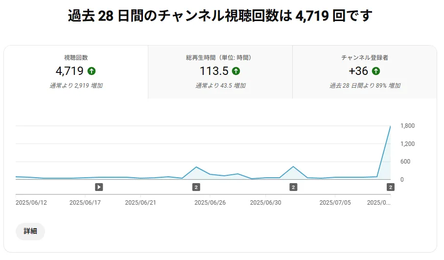 しかし、ショート動画は投稿した当日に2,000再生ぐらい視聴され、その後は全く視聴されないという特性があることが分かりました。YouTubeチャンネルの運用は奥が深いですね。